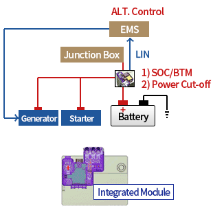 Intelligent battery disconnection system consist of current cut-off ratchet relay, integrated control module and battery current sensor which sense battery current, short circuit and control alternator.